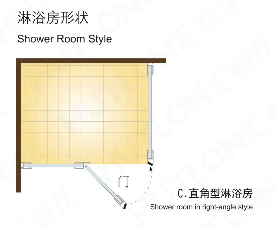 直角型淋浴房,用兩面玻璃與兩面墻一起組成方形,占據衛生間的一個角落,更多是正方形的衛生間使用。