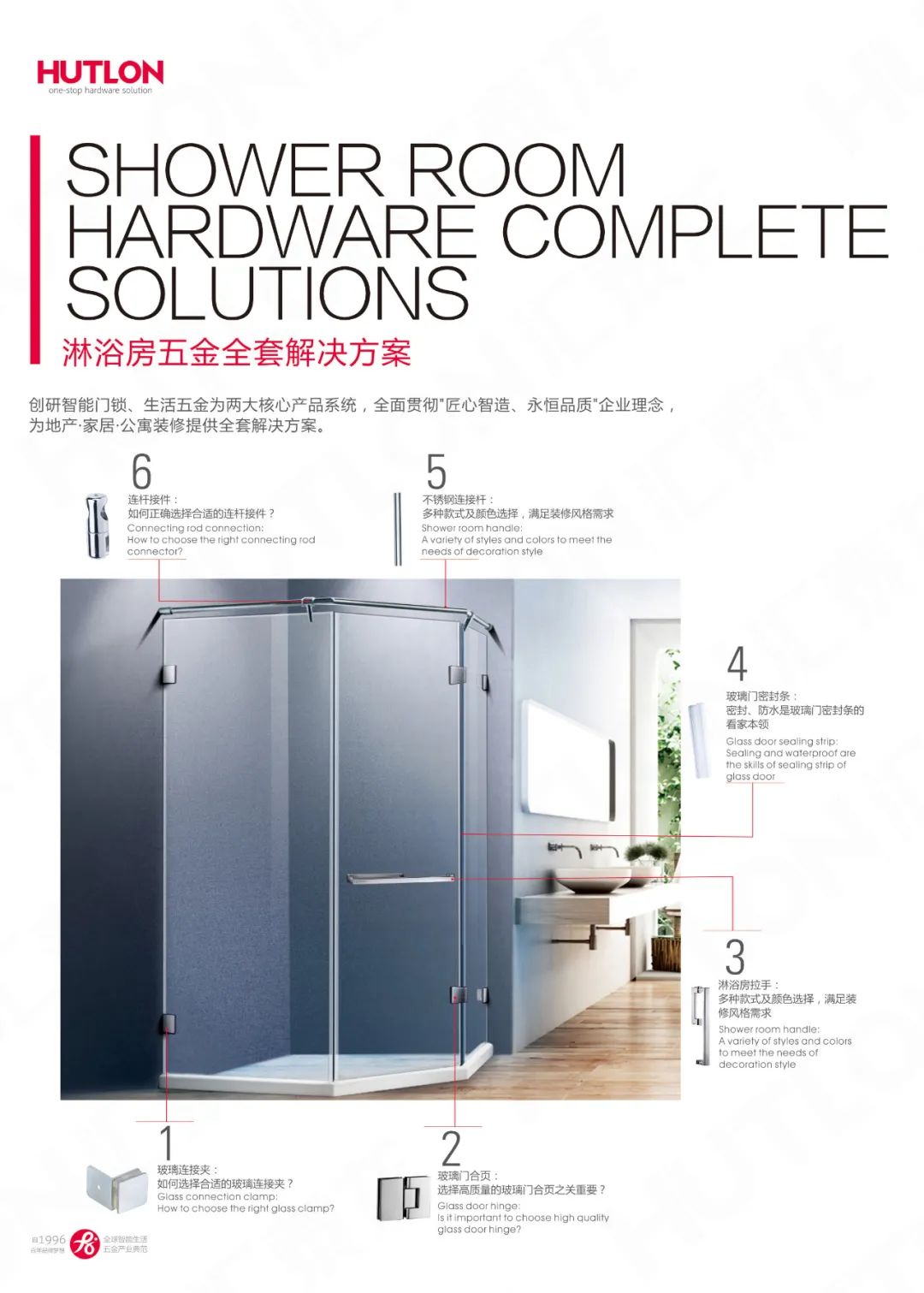 玻璃連接夾、連接桿與連桿接件,如果這三樣沒選好,直接影響該片玻璃的穩固性外,還間接影響淋浴房門的承重與固定,牽一發而動全身。匯泰龍玻璃連接夾有0°、90°、135°、180°等多種角度,能滿足整體淋浴房的組裝需要。產品以銅、不銹鋼為主要材質,加上表面經過多道處理工藝,經久耐用、歷久彌新。