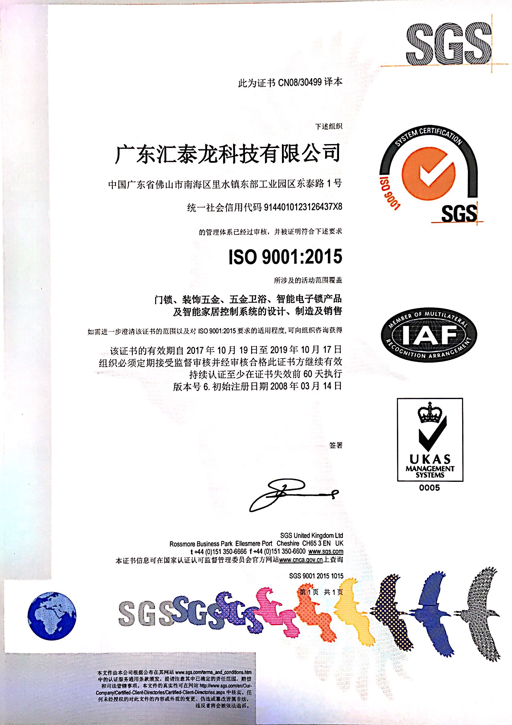 現今,匯泰龍通過并采用ISO9001質量管理體系、ISO14001環境管理體系、OHSAS18001職業健康安全管理體系、CNAS檢測和校準實驗室能力認可準則和GB/T29490知識產權管理體系等多項高標準體系認證,規范化管理,確保為用戶提供智能生活五金全系統解決方案,一站式供貨,五星級服務。