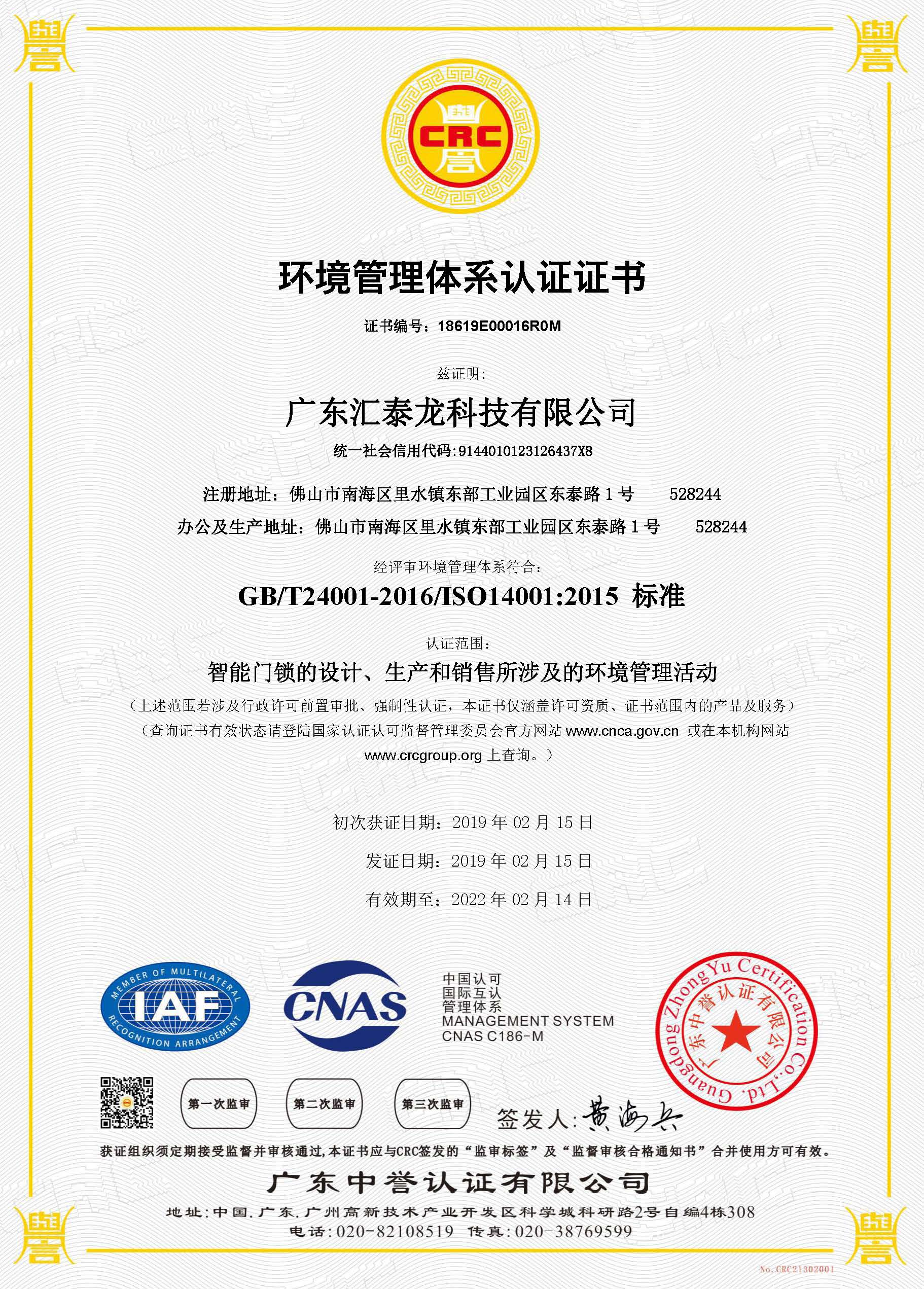 環境是人類賴以生存的條件,關系到人類可持續性發展。良好的環境管理有利于企業的可持續及長足發展,亦是企業承擔社會責任的體現。2019年,匯泰龍通過GB/T24001-2016/ISO14001:2015環境管理體系認證,在環境管理方面更上一個臺階