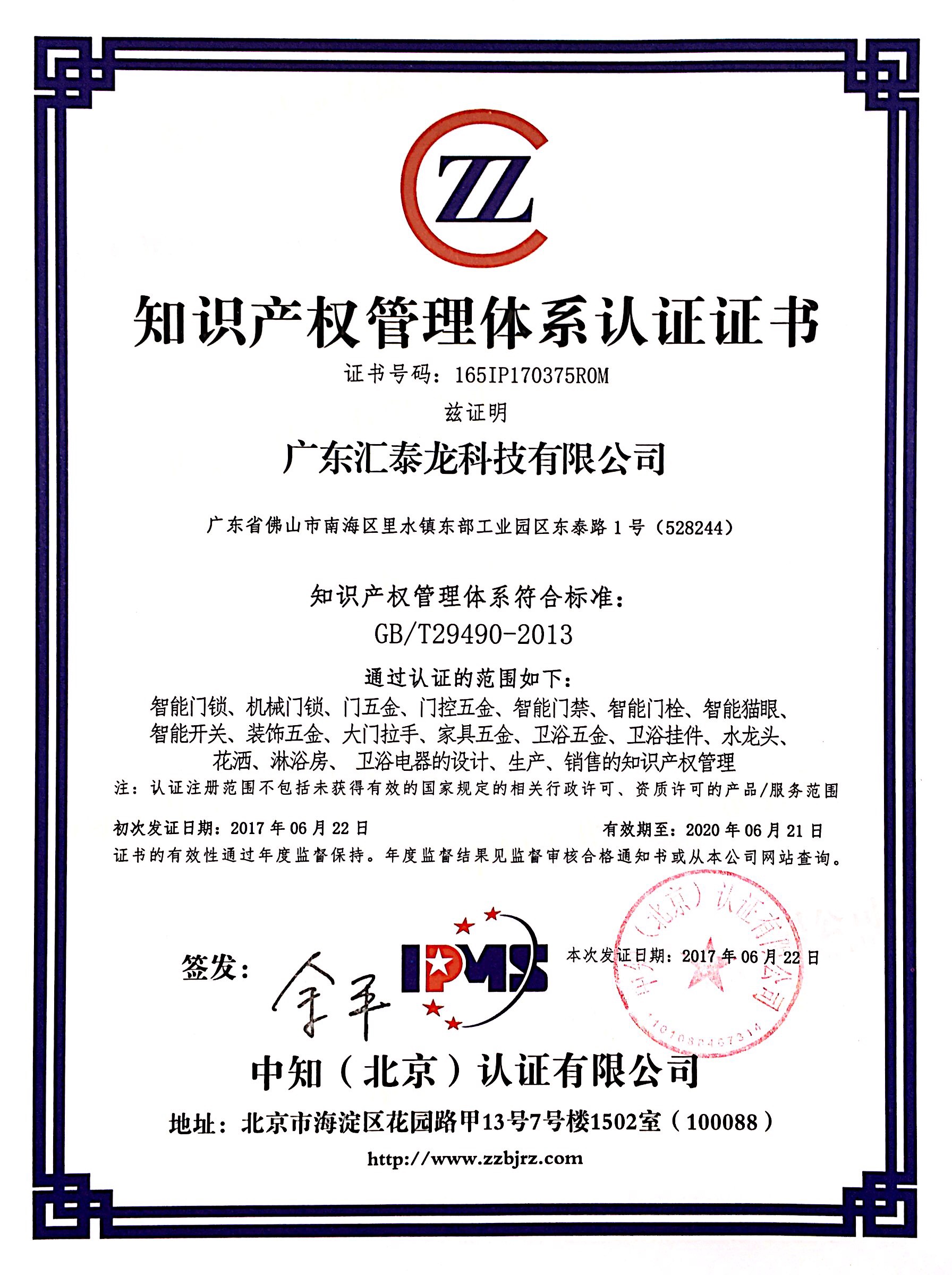 匯泰龍“匠心智造,永恒品質”,2017年,匯泰龍通過GB/T29490-2013知識產權管理體系認證,規范化、體系化管理匯泰龍知識產權,提升匯泰龍自主研發實力以及知識產權競爭力。