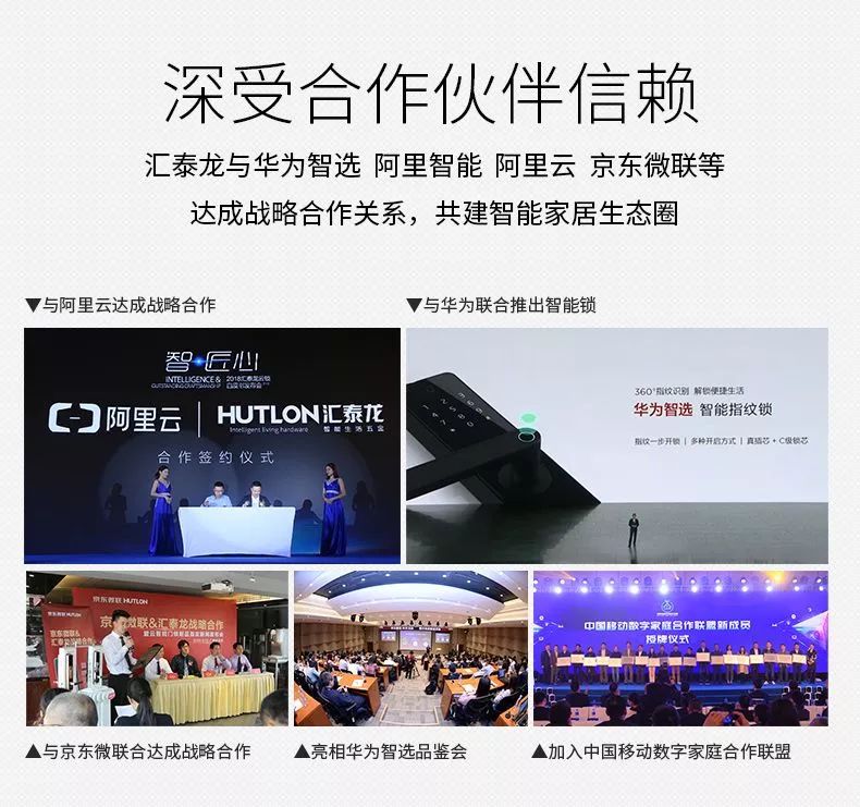 行業巨頭,精誠合作。2016年,匯泰龍在傳統的智能門鎖基礎上融入了云技術,率先行業推出能聯網、能遠程監控的匯泰龍安全云鎖,并與各大行業巨頭達成戰略合作。