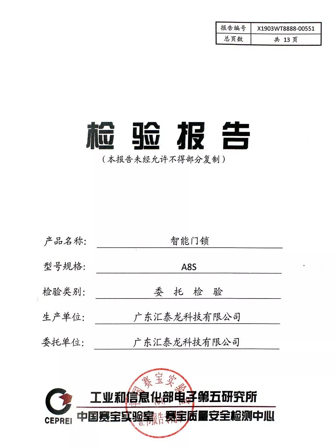 匯泰龍A8s旗艦智能鎖通過國家安全防范報警系統產品質量監督檢驗中心、公安部安全與警用電子產品質量檢測中心關于高溫、低溫、沖擊、自由跌落、阻燃、防磁場技術開啟、防破壞能力等60余項與安全息息相關的權威檢驗。