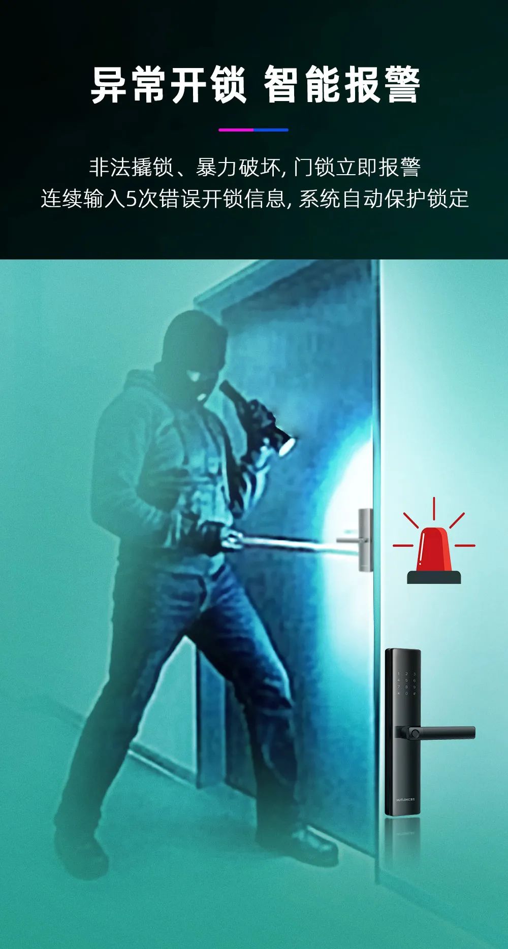 匯泰龍A100智能鎖內置多重傳感器,24小時實時監測,智能守護家門。若遇到不法分子撬鎖、暴力破壞,門鎖立即響起警告聲,嚇跑不法分子,引起附近人注意。