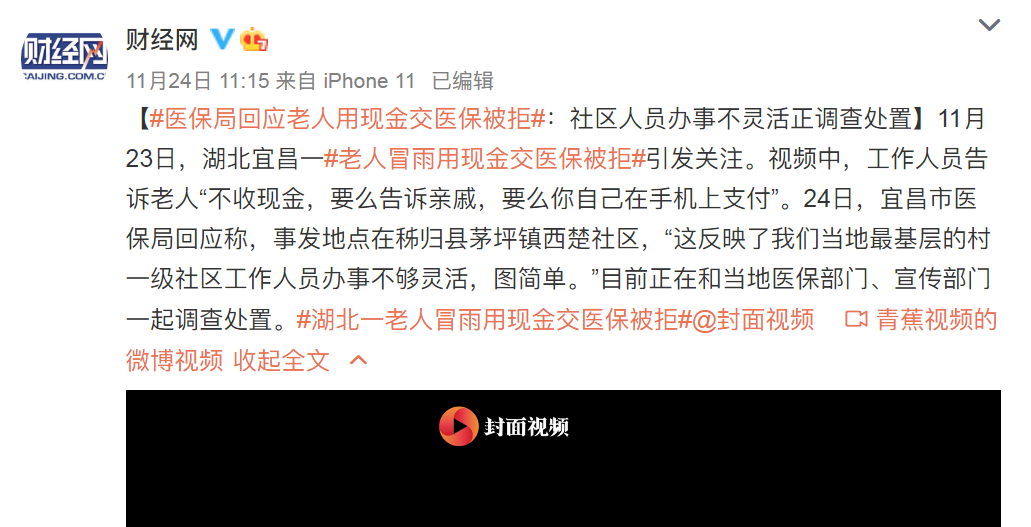 事件中,一名老人獨自冒雨來交醫保,因為拒收現金而滿臉無助。