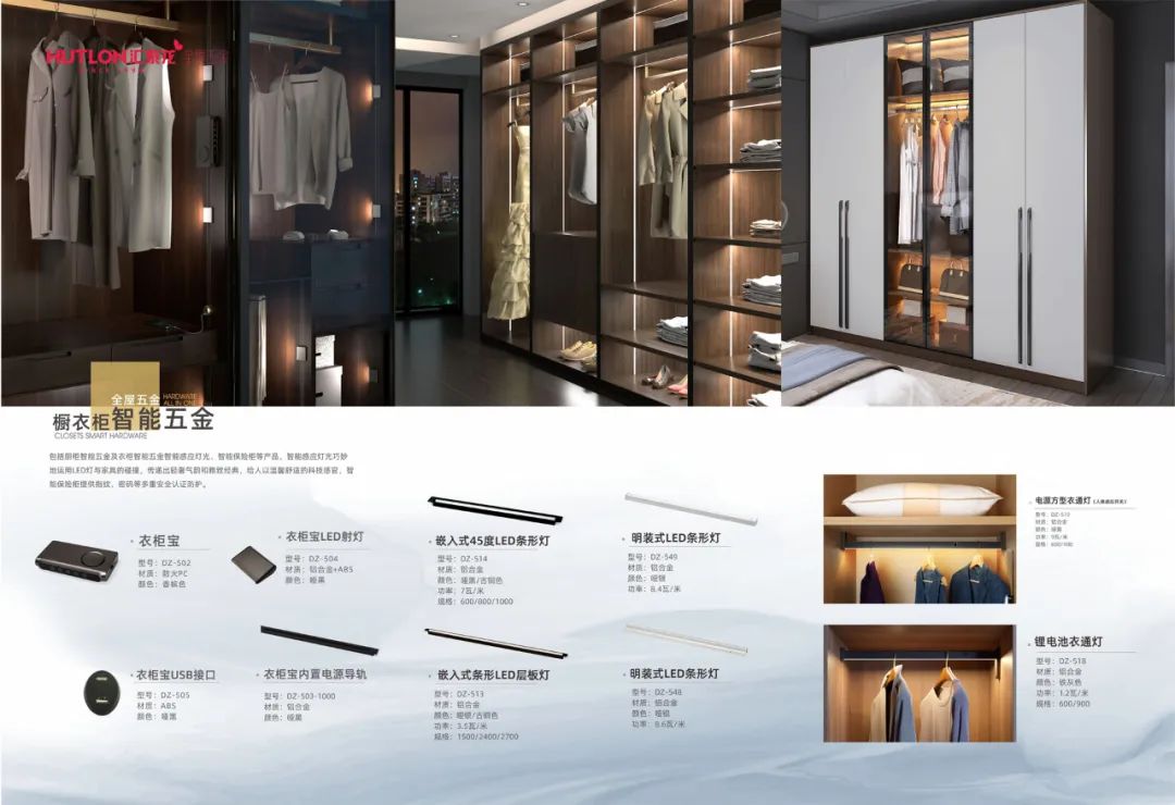 密碼指紋保險抽屜、指紋藍牙柜鎖、指紋鉤鎖,智能讓珍愛的物品有更為堅實的守護;衣柜寶套裝集紫外線殺菌、柔風加熱去潮、超聲波驅蟲等功能于一體,智能讓衣物更為整潔干凈;智能感應燈光,照亮櫥衣柜的每一處,讓每一樣物品都清晰可見,智能讓使用更為貼心。櫥衣柜智能五金全套解決方案,讓智慧融入生活,讓生活更為便捷、安全、舒適。