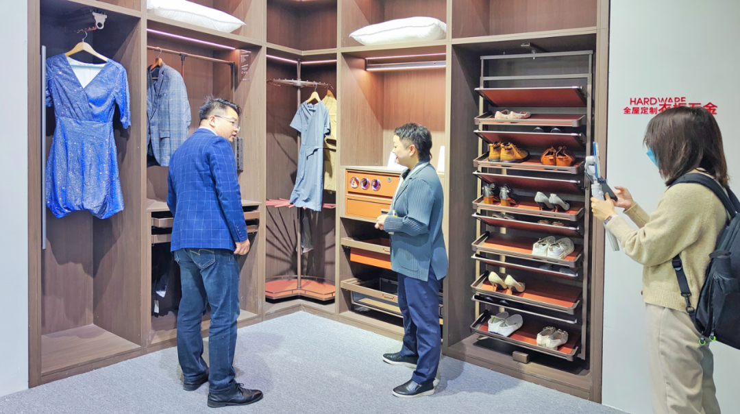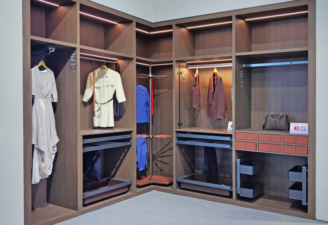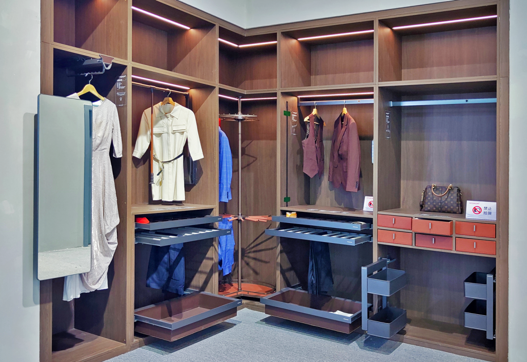 在衣帽間場景,緩沖收納籃、緩沖飾品籃、緩沖褲架、頂裝掛衣架、升降掛衣架、轉角選擇衣物籃、旋轉鞋架等多種款式的衣柜收納五金,讓每件“戰袍”、飾品充分展示魅力。金屬與皮質的表面材質碰撞出美學,兼具視覺美感和實用功能性,客商駐足忘返,感受有格調的精致生活。