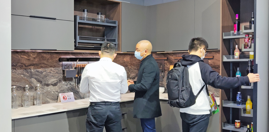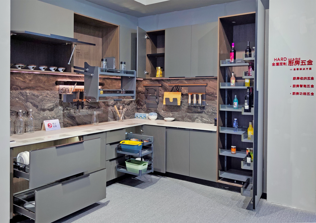 進入展館,映入眼簾的是廚房場景。吊柜升降籃,讓吊柜的利用率更高;碗碟籃、平籃、調味籃、側裝拉籃、轉角全開小怪物、高伸拉籃等廚房收納五金,不浪費櫥柜的每一分空間,發揮“小空間,大收納”的作用。