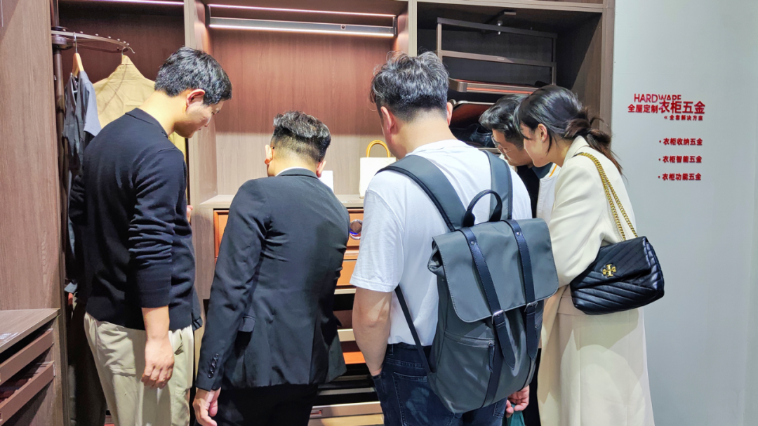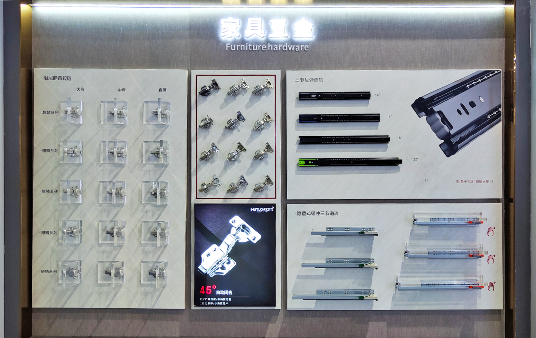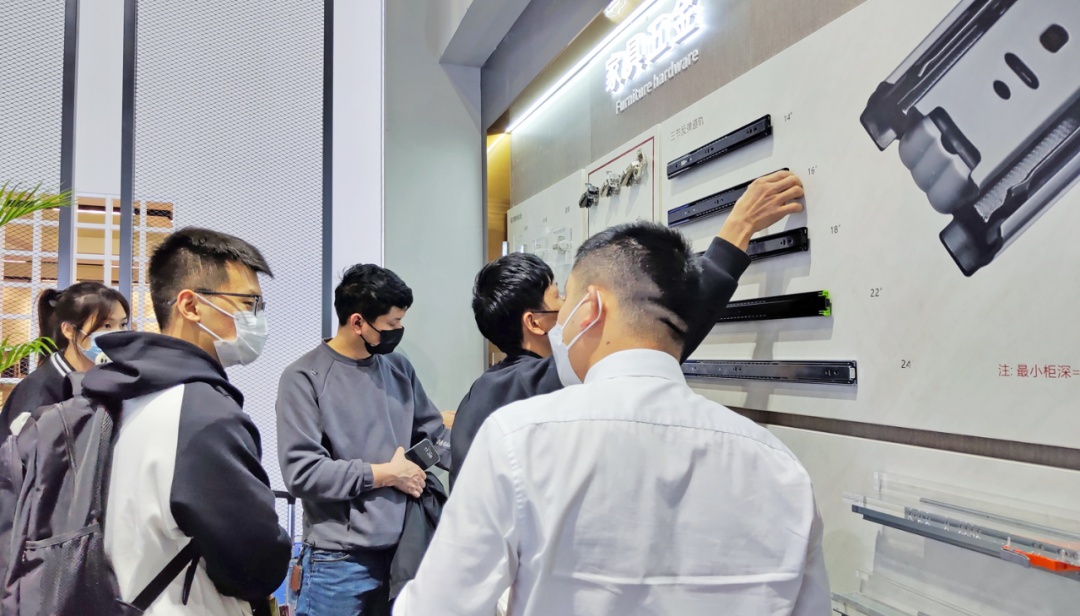 在家具五金展示專區,門配移門五金攜手登場。分為墻面展示區、鉸鏈功能體驗和抽屜體驗四個部分,充分展示了緩沖鉸鏈、三節緩沖自閉道軌、三維可調暗鉸鏈、緩沖液壓合頁、銅合頁、門吸、地吸、反彈器、暗插銷、防盜扣、吊輪等五金產品。