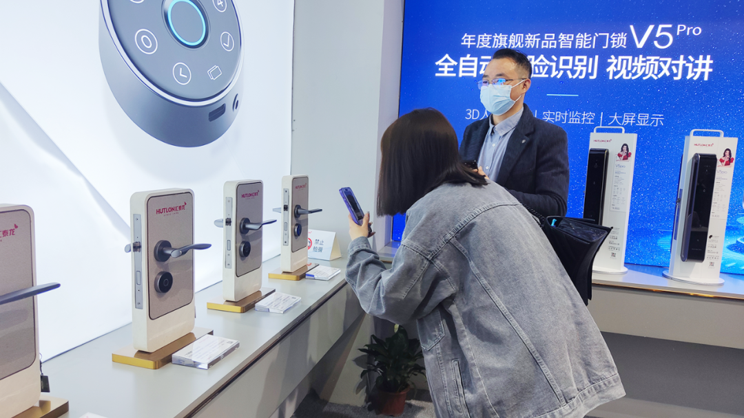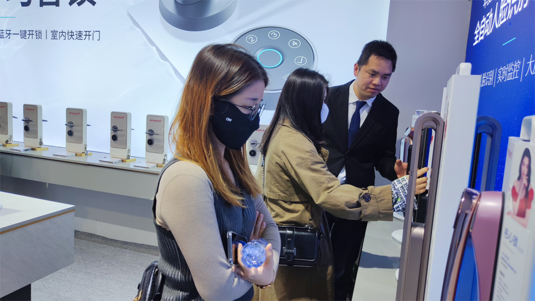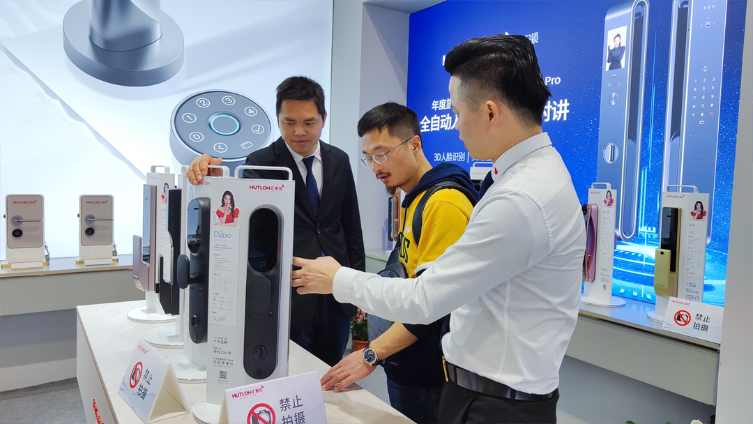本次參展的V5pro、V3pro和D2pro三款智能門鎖新品兼具人臉識別與視頻功能,吸引客商們紛紛體驗:不用喚醒,靠近智能鎖即自動喚醒并識別,識別成功后,自動開鎖,關門自動上鎖。客商競相體驗黑科技生活。