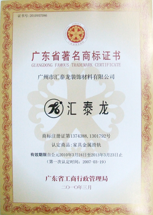 根據(jù)《廣東省著名商標(biāo)認(rèn)定和管理規(guī)定》和《廣東省工商行政管理局關(guān)于廣東省著名商標(biāo)認(rèn)定和管理的實(shí)施細(xì)則》的規(guī)定,經(jīng)廣東著名商標(biāo)評(píng)審委員會(huì)評(píng)審?fù)ㄟ^,繼2006年首次認(rèn)定后,2010年3月,廣東省工商行政管理局再次認(rèn)定“匯泰龍”商標(biāo)為廣東省著名商標(biāo)。