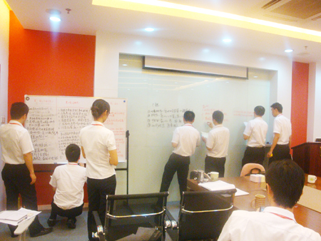 培訓課上,全體學員被分為三個學習小組,針對“目前經銷商營銷管理遇到的常見問題”、“經銷商營銷管理的方法”、“提高經銷商營銷管理的途徑”等主題展開討論,并由組長把學員的討論結果公布出來。學員們積極討論,踴躍發言,寫滿了整整一個黑板。在這些觀點中,顯現出了許多優秀的營銷觀點,有的觀點從人才引進和人才管理方面出發,有的觀點從市場開拓方面出發,還有的從品牌推廣等等方面出發提出了具體的措施和方法。徐副總發動全體學員針對每一小組提出的方案一一評定,對方案的可執行性和合理性作了詳細的分析。在這次頭腦風暴式的培訓課程中,大家暢所欲言,在提高經銷商營銷管理能力水平方面收獲頗豐。