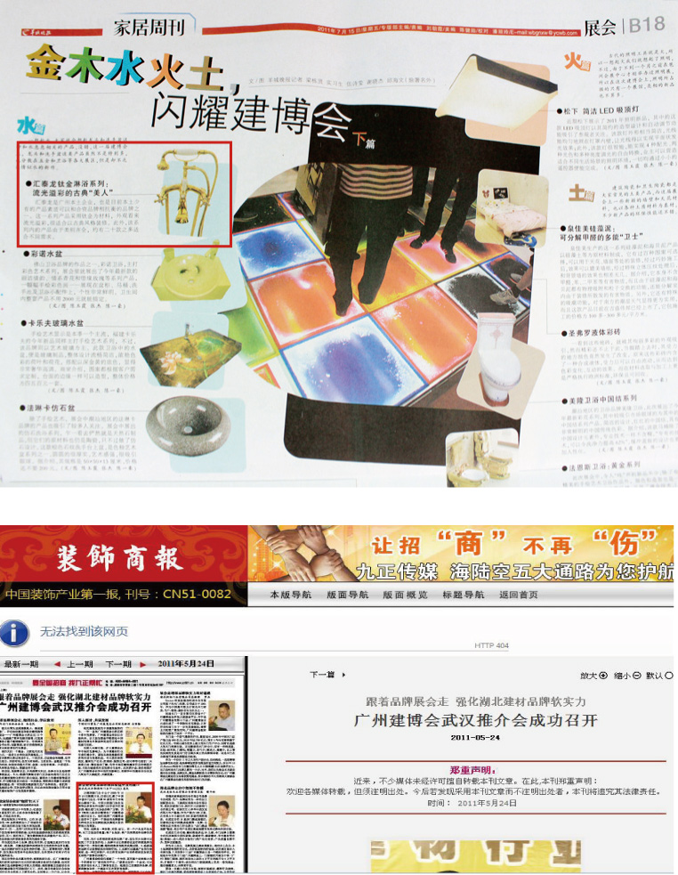 《裝飾商報》摘自陳董在建博會武漢推介會上的講話:作為廣州建博會一名忠誠的合作伙伴,作為一個全國知名的五金衛浴品牌,匯泰龍一直努力打造匯泰龍夯實的企業文化與品牌文化。……置身于這劇烈的國際性市場當中,已有十五年歷史的匯泰龍五金衛浴深知,有品牌才有世界地位!……