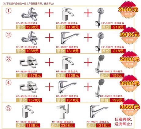 價值 218 元 HF-95671手持花灑一個 (價值 1138 元 HF-95251臉盆龍頭或價值 1318 元 HF-95277廚房龍頭,二款選一)。