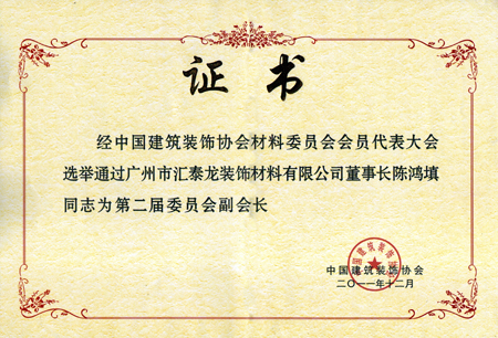 正因為如此,中國建筑裝飾界最權威的組織——中國建筑裝飾協會,于近日欣然授予匯泰龍公司“中國建筑裝飾協會材料委員會副會長單位”的榮譽,同時授予匯泰龍董事長陳鴻填先生"第二屆委員會副會長"榮職,這也是繼2011年全國裝飾材料工作會議上董事長榮獲“優秀企業家”、公司榮獲“全國裝飾材料行業優秀企業”后的又一殊榮。