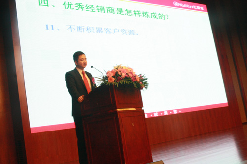 匯泰龍公司總經理徐振忠先生作了主題為《回顧2011,挑戰2012》重要的工作報告,報告內容分為以下七個重要的部分:一、回顧2011年總公司主要工作計劃的執行情況;二、回顧2011年經銷商"如何實現優秀銷售業績"執行情況;三、效益好的經銷商與效益一般的經銷商區別;四、優秀經銷商是怎樣煉成的?五、2012年總公司的營銷思路;六、2012年總公司主要投入與規劃;七、對經銷商的要求。徐總首先利用數據向大家展示了在總公司和全體經銷商共同努力下,匯泰龍品牌取得的可喜成績,接著從生產能力、研發設計、物流供應、供貨能力、品質檢驗、廣告投放等經銷商十分關注的問題作了詳細的工作計劃報告,進一步加強了經銷商對公司未來產品生產、研發、品控、品牌推廣等方面的了解和信心。他還利用非常直觀的方式向大家介紹了決定經銷效益的關鍵性因素。最后,徐總對在座的經銷商們提出了新年度總公司對經銷商在合作共贏、共同發展新的要求和期望。