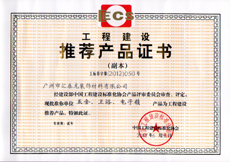 經過嚴格的審查、審核、審批程序,中國工程建設標準化協會于629日正式頒發匯泰龍裝飾材料有限公司《工程建設推薦產品證書》。