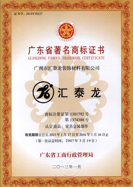 近日,廣州匯泰龍裝飾材料有限公司匯泰龍品牌通過(guò)廣東省著名商標(biāo)認(rèn)定委員會(huì)審核認(rèn)定,被延續(xù)授予“廣東省著名商標(biāo)”榮譽(yù)。這是自2007年3月頒發(fā)此榮譽(yù)后又一次的認(rèn)定。此稱(chēng)號(hào)的獲取,是匯泰龍名牌戰(zhàn)略不斷推進(jìn)的結(jié)果,是公眾對(duì)“匯泰龍”品牌優(yōu)良品質(zhì)的認(rèn)可,它標(biāo)志著匯泰龍品牌建設(shè)又邁上了嶄新的臺(tái)階。