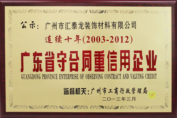 匯泰龍公司自成立以來,嚴(yán)格遵守《中華人民共和國合同法》和公司關(guān)于合同管理的相關(guān)規(guī)定、強(qiáng)化合同管理機(jī)制、加強(qiáng)公司合同信用建設(shè)。經(jīng)過十七年的發(fā)展,匯泰龍人深刻理解“人無信不立,企無信不興”這一信條,并以“品質(zhì)造就滿意”作為經(jīng)營理念深深的把“誠信”植根于每一個匯泰龍人的心中,把“誠信”貫徹到日常工作的方方面面。“廣東省守合同重信用企業(yè)”榮譽(yù)稱號是誠信企業(yè)的金字招牌,是對企業(yè)信用的最權(quán)威評定。誠信是企業(yè)發(fā)展的興業(yè)之本,更是企業(yè)塑造品牌的立足之本。匯泰龍把“守合同重信用”作為打造成社會誠信的標(biāo)榜,積極做好誠信體系建設(shè),為打造“誠信廣州”和促進(jìn)中國裝飾材料行業(yè)市場又好又快發(fā)展做出新的更大的貢獻(xiàn)。