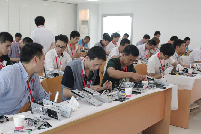 本次智能電子鎖培訓分為14日、15日、16日三天,培訓內容分為:智能電子鎖理論知識、智能電子鎖安裝實習操作、結業考試三個部分。培訓主講為公司電子鎖業務部經理黎宇先生,課程內容有智能鎖市場分析、匯泰龍智能電子鎖介紹、操作使用、安裝與調試、售后服務。由于參與本次集訓的人員多為一線銷售人員及售后安裝服務人員,所以本次的培訓著重于介紹產品內部結構原理,讓學員更深入地了解電子鎖構造和工作原理。所有學員均配備一把實習專用電子鎖,現場跟隨培訓講師將一把完整的電子鎖拆裝成零星的小部件,再重裝還原。培訓采用幻燈片演示以及現場實操演練相結合,直觀地展現了匯泰龍智能電子門鎖內部結構和性能特點,從大家的自由討論中總結匯泰龍新款智能電子鎖的優勢,在實操部分,大家按照老師所教的步驟自由拆裝鎖體,對鎖的操作和內部結構有了更加詳細的了解,讓大家更加深刻了解了新產品的特性。此次培訓從裝配、安裝、到調試、售后服務都從“品質造就滿意”出發,目的在于為廣大的消費者提供最優質的產品品質、最先進的營銷品質、最完善的服務品質。為了及時檢驗培訓效果,在培訓結束后,進行了嚴格的實操考試,并對培訓合格的學員頒發了《匯泰龍智能電子鎖培訓合格證書》。