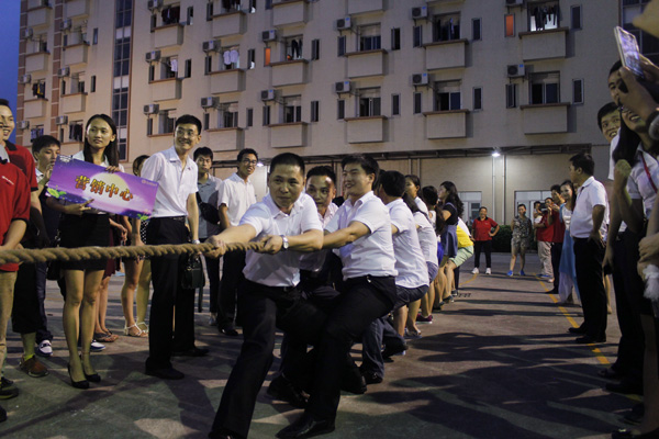 每年的中秋活動,拔河項目都會成為整場活動的焦點。全公司以中心為單位,被分為八支隊伍。哨聲一響,男女隊員就位,大家挽起衣服袖子,憋紅了臉,在紅頭繩的左右搖擺中,加油聲一浪高過一浪。在拔河比賽過程中,也出現了一些啼笑皆非的“笑料”:有人衣服都扯亂了,有人鞋子掉了,還有人累得一屁股坐在了水泥地上。叫喊聲、加油聲、歡笑聲布滿了整個活動現場。最終,制造中心憑借雄厚實力,輕而易舉把冠、亞軍收入囊中,人事行政中心攬得季軍。