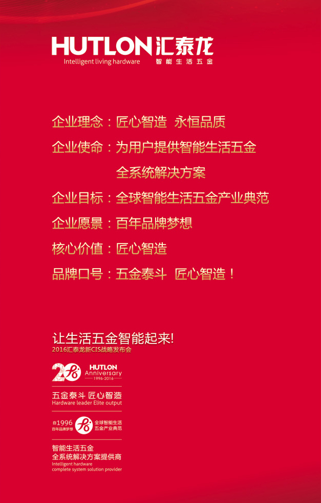 在匯泰龍品牌走過二十周歲之際,智能家居時代賦予匯泰龍新的使命和定義:打造國際高端智能生活五金第一品牌!延續求實、向上、敬業、和諧的文化根基,傳承匯泰龍20年輝煌底蘊及品牌影響力 。