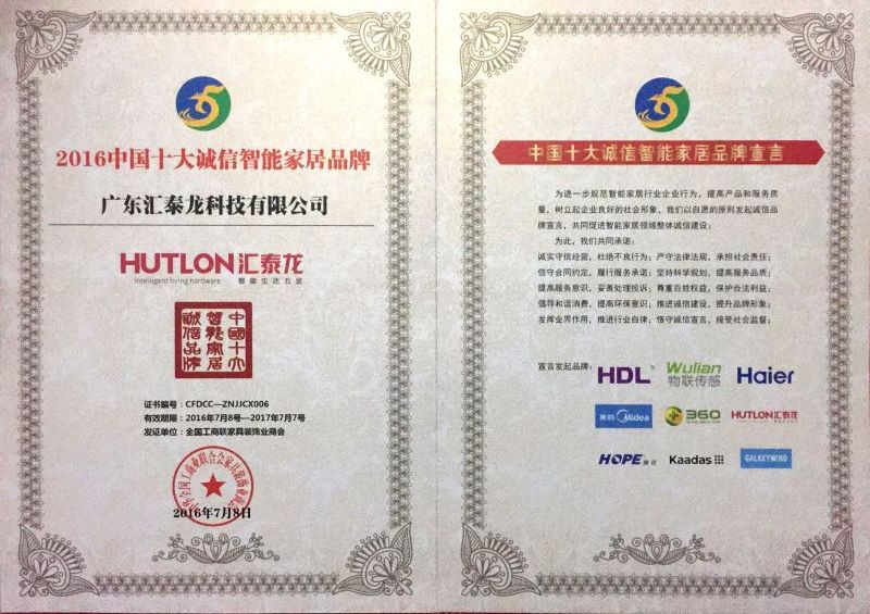 在此期間,匯泰龍參加了第四屆中國互聯網與智能家居誠信建設大會,與此同時,匯泰龍更被全國工商聯家具裝飾業商會授予“2016中國十大誠信智能家居品牌”稱號。