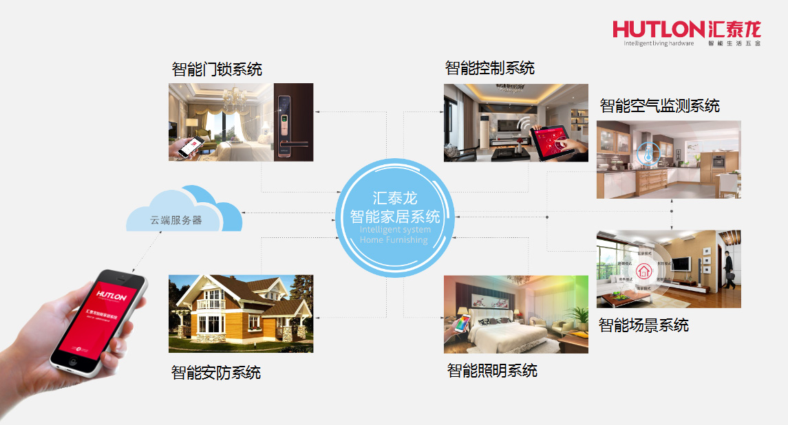 匯泰龍智能家居系統整合智能門鎖、智能安防 、智能控制、智能空氣監測、智能照明、智能場景六大功能模塊,實現對整體人居環境的燈光、音樂、家電、安防、能源等各種情景的控制和聯動,為用戶提供全系統解決方案,讓美好的智能生活觸手可及。