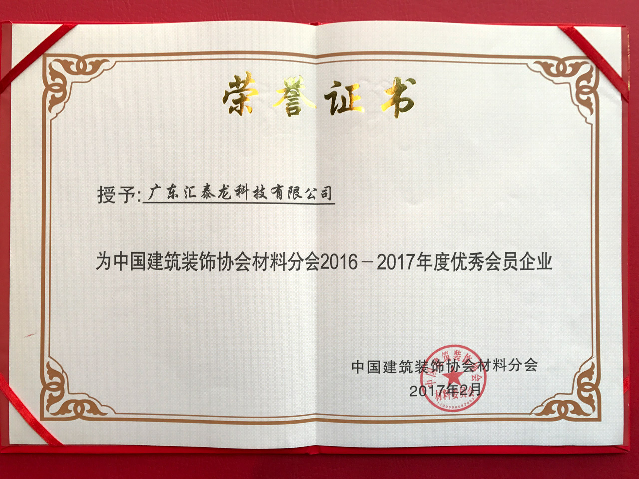 匯泰龍榮膺「中國建筑裝飾協會材料分會優秀會員」