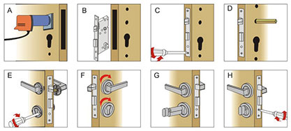 2、將鎖體放入孔;預緊襯板螺釘,分別從鎖圈和執手圈上拆出外蓋,將方桿穿過門板插入鎖體(如下圖:B-D)。