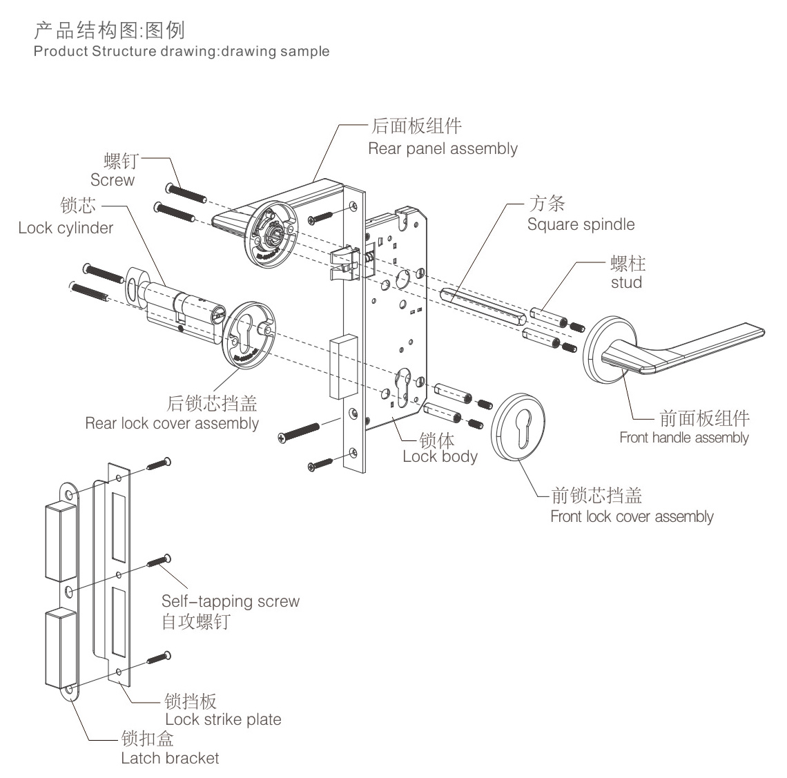 2、將鎖體放入孔;預緊襯板螺釘,分別從鎖圈和執手圈上拆出外蓋,將方桿穿過門板插入鎖體(如下圖:B-D)。